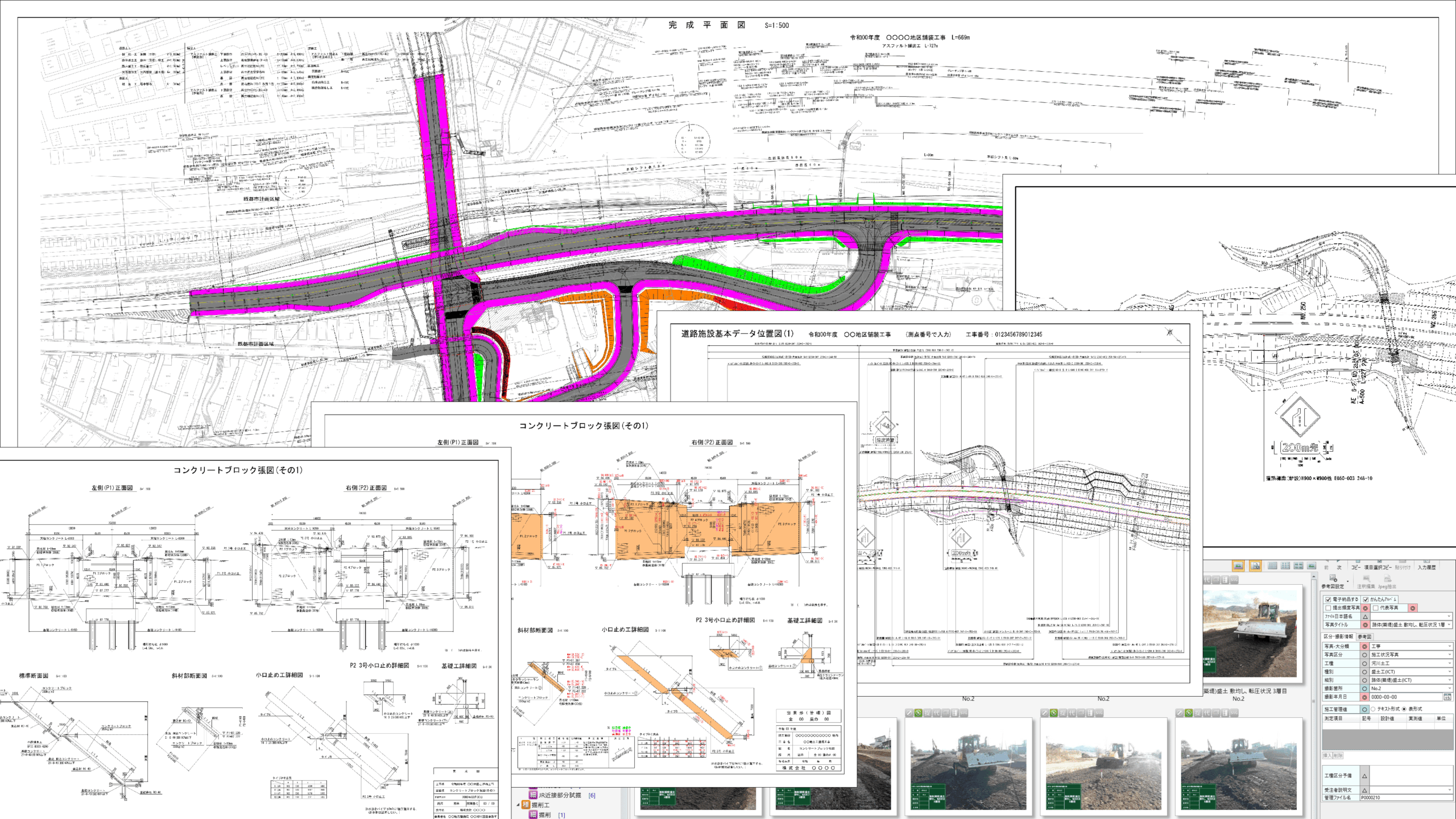 出来形(管理)図や工事完成図をはじめ、道路舗装工事の納品書類として求められる道路工事完成平面図・縦断図、さらには道路施設基本データの作成にも対応。